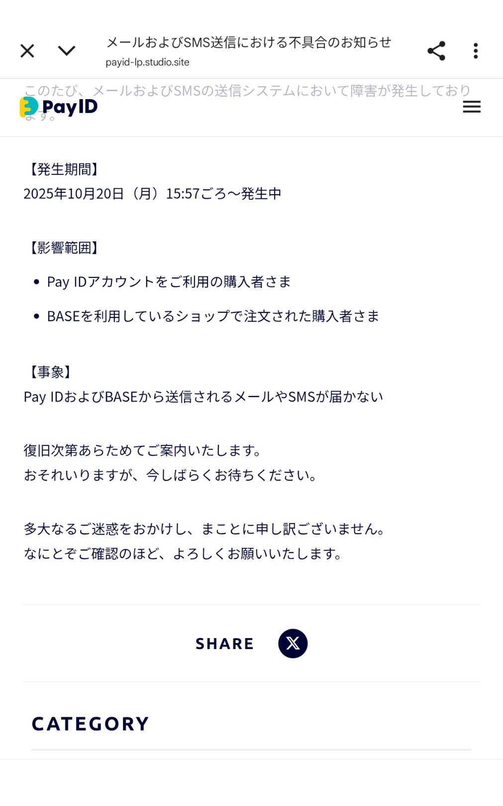 PayIDメールお呼びSMS送信における不具合のお知らせ